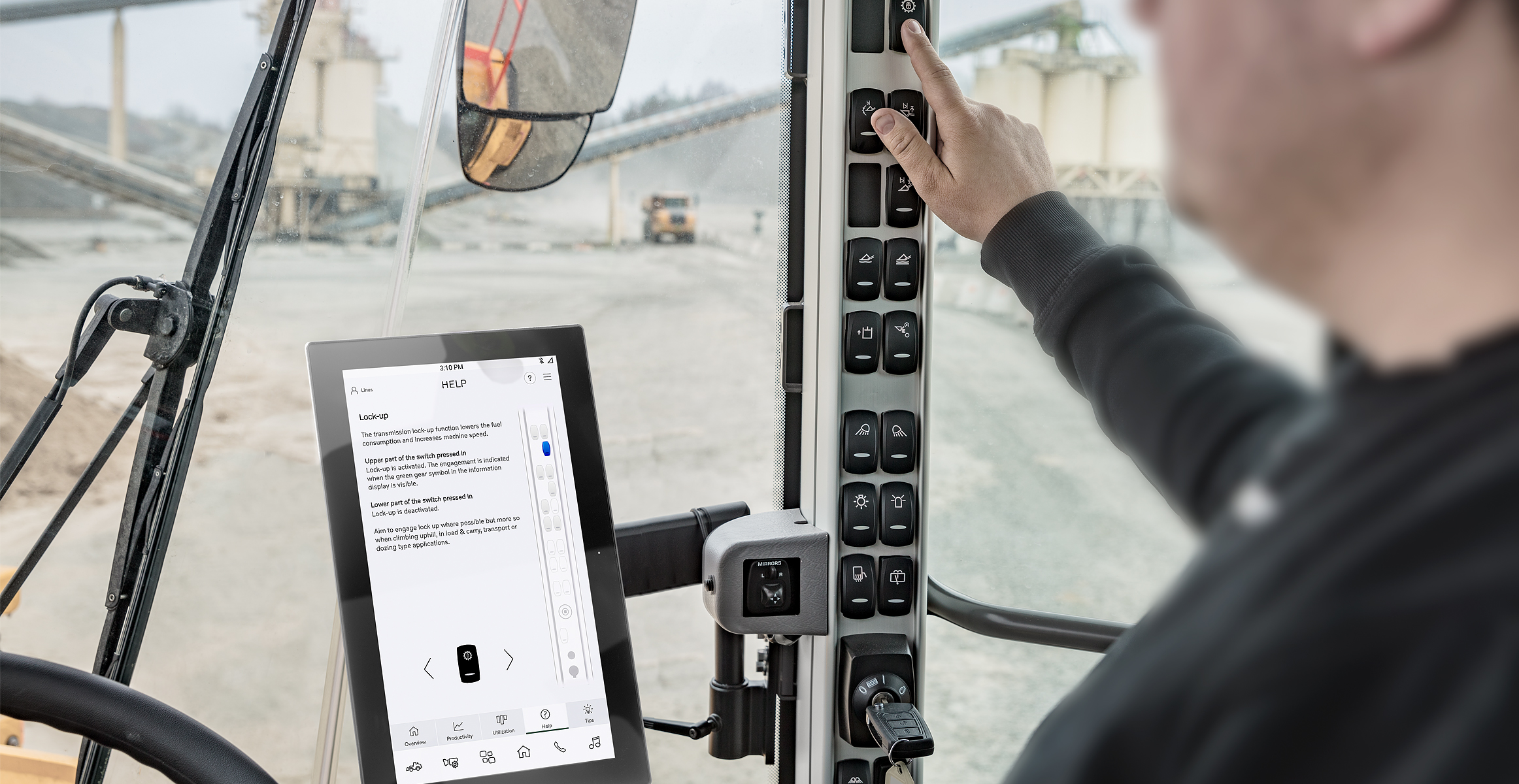 | Interactive guide | Information on the switches located on the A-pillar | Dynamic tips based on operator behaviour and a tips library |